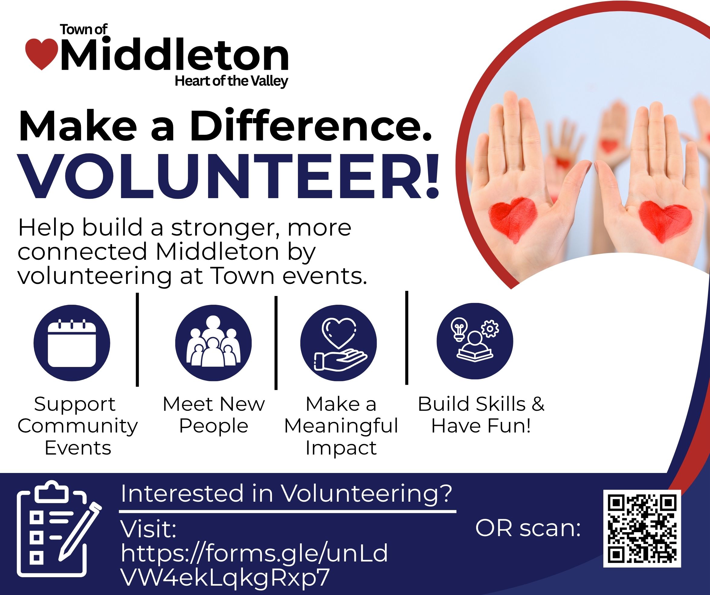 The Town of Middleton is seeking volunteers to help with Town organized events in Middleton. This is a great opportunity to support your community, meet new people, make a meaningful impact, build new skills, and have fun! If you're interested in volunteering at events, fill out this quick form: https://forms.gle/unLdVW4ekLqkgRxp7